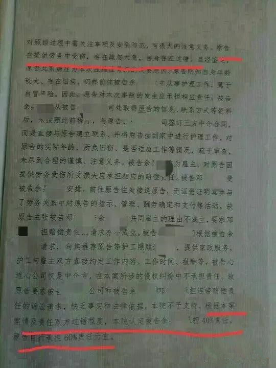2018年9月,沙坪坝区人民法院经过审理后,宣布了一审判决结果:认定保姆与雇主之间存在劳务关系,保姆工作受伤,雇主应承担40%责任,赔偿保姆3.5万余元医疗费用;认定保姆明知自己年龄较大、存在旧疾,仍前往雇主家中从事护理工作,属于自冒风险,判定其承担60%责任;判定中介公司不担责。