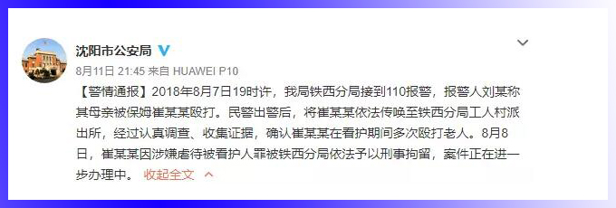 沈阳市公安局昨夜在官微对此事发布警情通报:8月8日,崔某某因涉嫌虐待被看护人罪被铁西分局依法予以刑事拘留,案件正在进一步办理中。