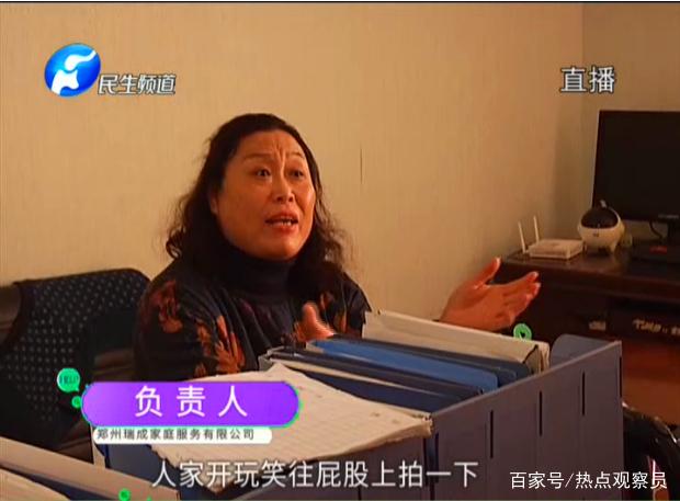 从监控中确实看到了保姆打孩子的屁股和推到孩子,但是保姆和家政公司是怎么对这个进行解释的呢?于是记者跟着赵女士来到了家政公司。来到家政公司之后,家政公司的负责人却说,那不是保姆在打孩子,而是在和孩子开玩笑,往屁股上拍一下。这时张女士就说了,你认为哪个行为叫打,孩子都已经哭了,还不叫打,你觉得哪个行为才叫打?而家政公司的负责人则对张女士说,你可以走司法程序给孩子去做鉴定,一切法律程序都可以走,这时张女士更恼怒了,难道说只有我的孩子受伤了以后才叫做打吗,非得有伤情报告才处理吗?