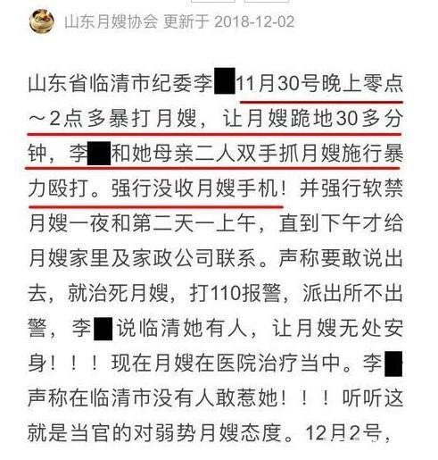 记者在12月5号从知情人口中了解该事件的一些细节和情况,该月嫂被施暴后没能马上回家。被雇主一家进行了强行软禁,整个晚上都回不了家。第二天早上也一样不给出门,直到下午才让回家。月嫂临走前,对方威胁称说出去的话就会把她给弄死。对着月嫂叫嚣在临清没人敢惹她,她有的是人。据了解该公职人员叫李静,被打月嫂叫姜淑君。李静现在没有上班,属于产假期间,被打月嫂现在在医院接受治疗,当地警方也已经在做调查。相信此事很快就会有一个说法,希望该被打月嫂安心休养,不要被此事受到影响,民警一定会帮她讨回公道的。