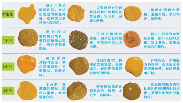 1、胎便:新生宝宝大便的颜色为什么是墨绿色呢?这是因为宝宝在妈妈肚子里面吞入的羊水和胎儿脱落的上皮细胞、毳毛、皮脂以及胆汁、肠道分泌物等所造成的。一般来说,出生后6—12小时会拉出墨绿色胎便,但是早产宝宝可能会晚一点。这种墨绿色的胎便,一般需要2—3天,随着母乳或者配方奶的加入、胎便慢慢排清,颜色才会慢慢变浅。