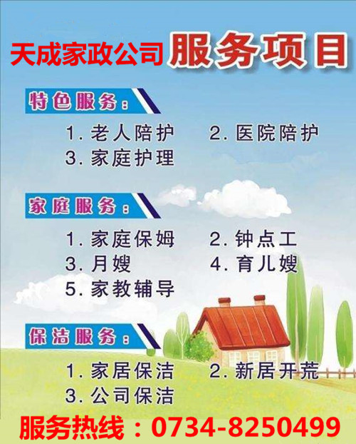 衡阳天成家政服务网注重提升家庭服务供给侧品质,衡阳天成家政服务网充分利用互联网+技术,衡阳天成家政服务网打造线上线下垂直一体化运营的先进模式和业务系统、衡阳天成家政服务网营销系统,贯彻"以用户为中心"的产品思维,通过专业化、标准化、职业化的全方位服务和培训体系,提升团队运营能力和服务人员的专业服务水准。衡阳天成家政服务网主要服务项目包括:月嫂、保姆、育婴师、钟点工、家庭保洁、货运搬家、家电清洗及维修、房屋维修、衣物洗护、家私护理、奢品护理、木地板打蜡、除螨、新居装修后保洁、除甲醛、绿植养护等。