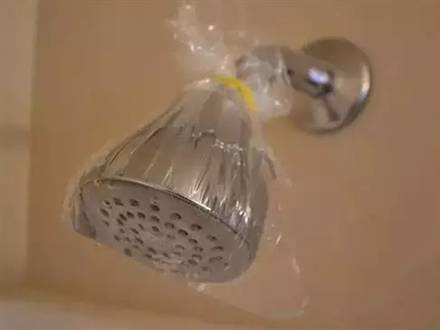 方法:拿一个塑料袋或保鲜膜,倒入白醋和清水,用橡皮筋绑紧在淋浴头上,浸泡两小时后,再打开冲洗干净即可。