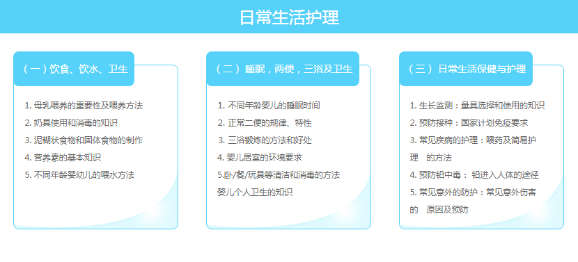 1.主要有饮食、饮水、睡眠、二便、三浴、卫生、营养配餐、辅食添加、衣服玩具清洁等,并适时负责家务料理。