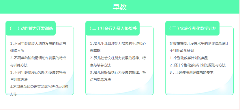 开展大动作训练,训练内容包括抬头、翻身、坐、爬、走、跑、跳;精细动作训练,训练内容包括手、眼、脑协调;开展游戏陪伴、儿歌、舞蹈、英语教育、发展测评、社会行为及人格培养等,并实施个性化教学计划。