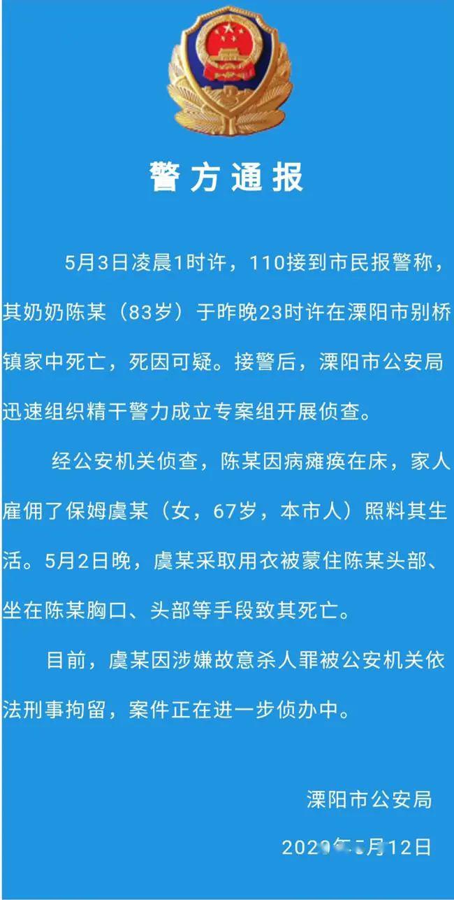 5月12日下午,溧阳警方对此案进行了通报。据通报称,5月3日凌晨1时许,溧阳警方110接到市民报警称,其奶奶陈某(83岁)于前一天晚上23时许,在溧阳市别桥镇家中死亡,死因可疑。接警后,溧阳市公安局迅速组织精干警力成立专案组开展侦查。
