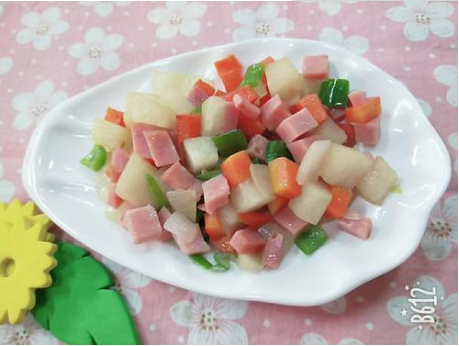 原料:胡萝卜100克、削皮荸荠200克、土豆100克、蘑菇100克、黑木耳10克;油、盐适量。