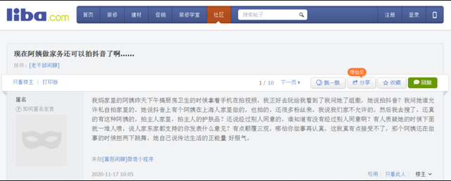 网友发帖质疑家政阿姨在雇主家拍抖音网络截图