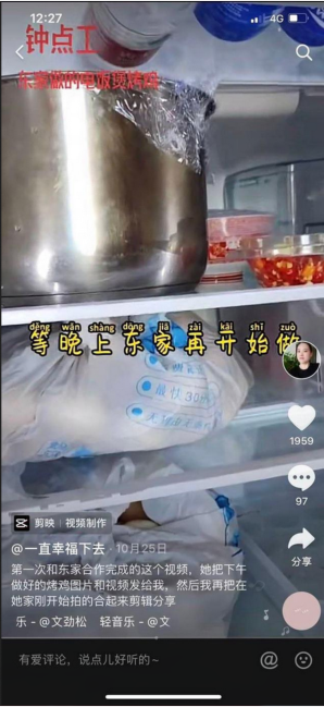 在大部分视频下,记者发现网友的留言互动都集中于咨询饭菜的做法、清洁物品的使用方式等。在该抖音号10月25日发布的一条视频中,“一直幸福下去”标注了这是“第一次和东家合作完成的视频,她把下午做好的烤鸡图片和视频发给我,我再把刚开始拍的合起来剪辑”。