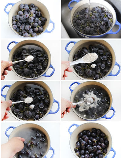 清洗方法:把葡萄放在水里面,然后放入两勺面粉或淀粉,不要使劲的去揉它,只需来回倒腾,然后放水里来回地刷筛洗,面粉和淀粉都是有粘性的,它会把那些乱七八糟的东西都给带下来。