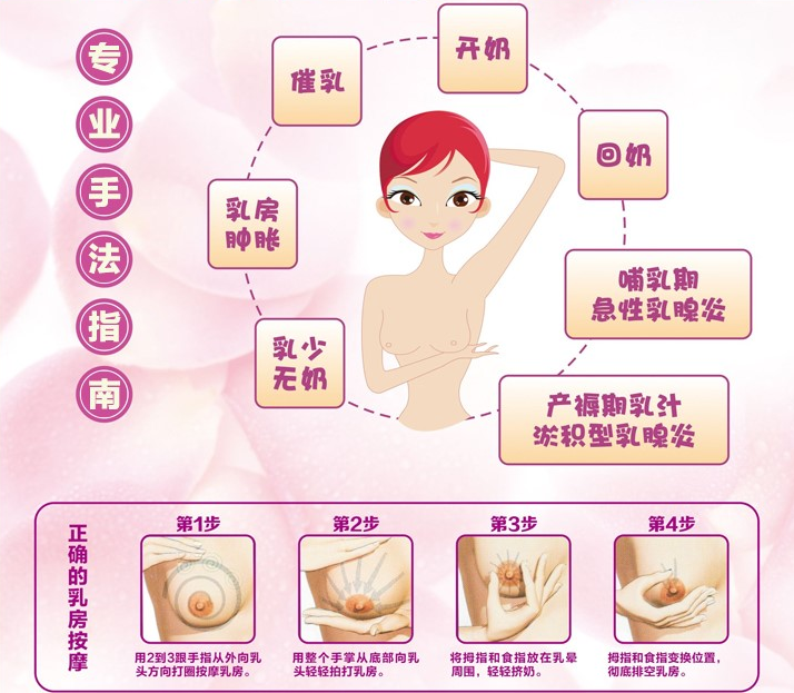 2、仍然是四指,成梳齿状从乳房外围根部向乳头方向梳理,乳房各个区域都要梳到,奶结区域尤其需要反复梳。