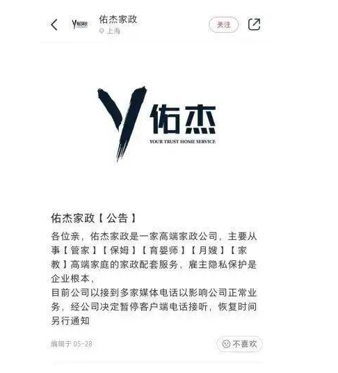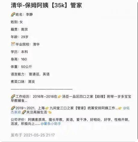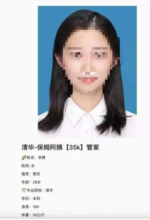 5月25日,上海佑杰家政服务有限公司在社交网络平台上发布了一则应聘信息,标题“清华-保姆阿姨【35k】管家”引人注目。据该求职消息,应聘者李静今年29岁,毕业于清华大学,本科学历,正寻求合适家庭担任管家工作,期待月薪3.5万元。