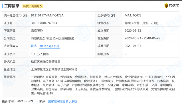 启信宝显示,涉事家政公司佑杰家政全称为上海佑杰家政服务有限公司,该公司成立于2020年6月,注册资本100万人民币,经营范围包括家政服务、保洁服务、婚庆礼仪服务等,该公司法定代表人及最大股东为沈杰。商标信息显示,该公司已申请注册佑杰家政、佑杰家教、佑杰母婴等商标,当前商标状态为申请中。