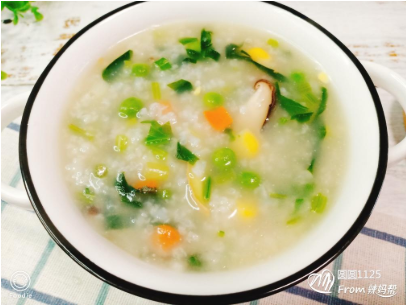 食材:大米75g、胡萝卜30g、菠菜5片、香菇1颗、玉米15g。