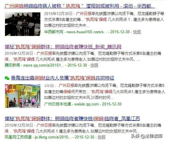 有个叫“吕思退”的网友,说了一句更可怕的话:“保姆杀老人快成潜规则了,行业内叫‘执死鸡’,干几天就把老人弄死,可以领一个月工钱。”吕思退的这句话,一下让我想起了另两起保姆杀害老人案。