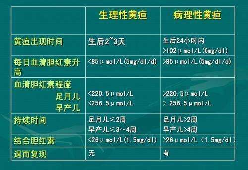 病理性黄疸:1、生后24h内出现;2.总胆红素每天上升>85umol/L(5mg/dl);3.黄疸持续时间较长,超过2-4周,或进行性加重。
